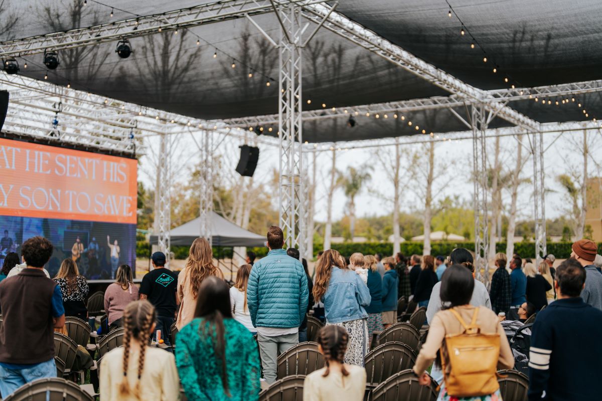 Enjoy a live stream of the service outdoors under the covered shade structure on the grass.