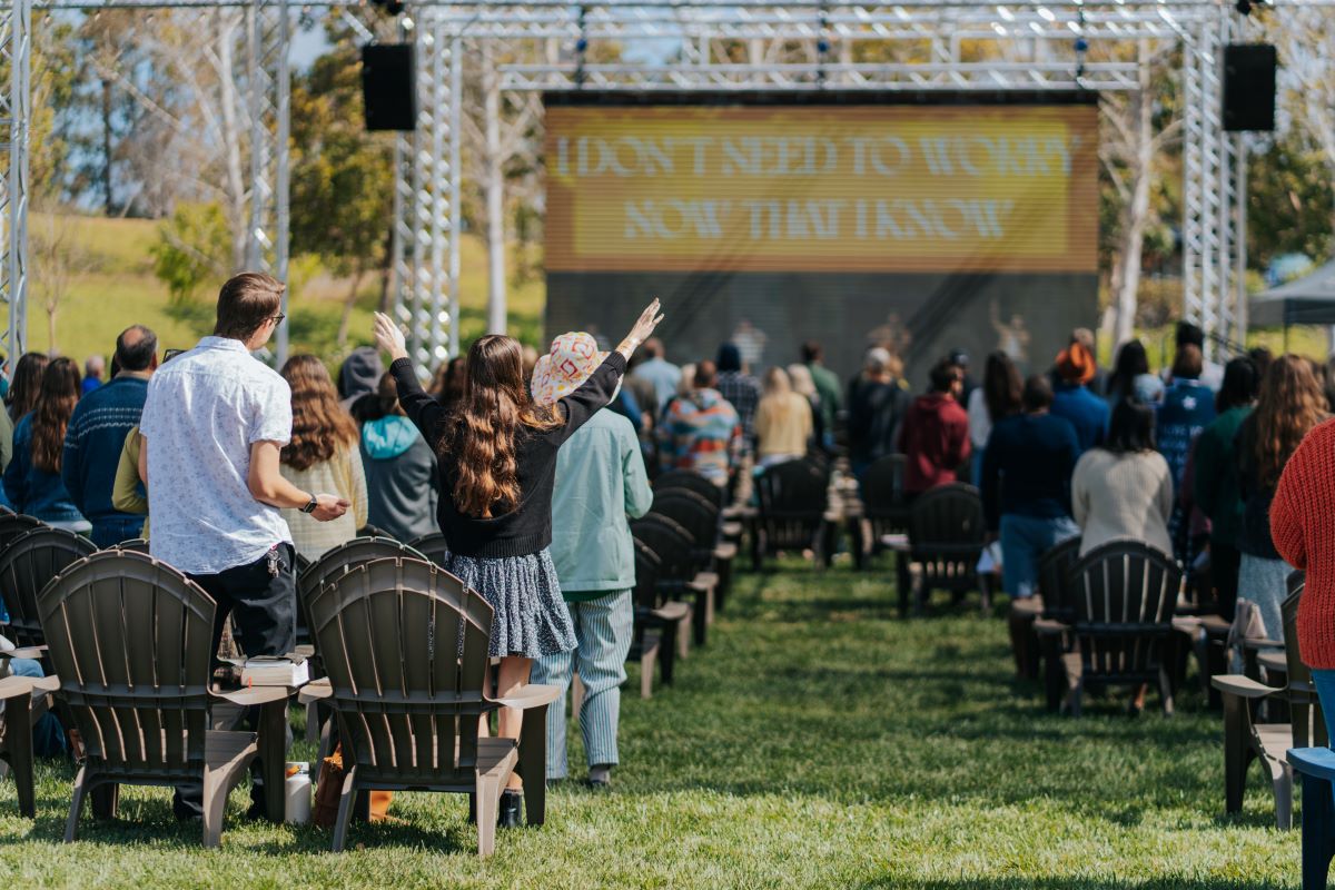 Enjoy a live stream of the service outdoors under the covered shade structure on the grass.